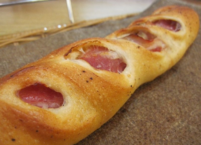 フランスパン生地にベーコンとブラックペッパーを入れ焼き上げました。薄くスライスしてビールのおつまみにどうぞ!