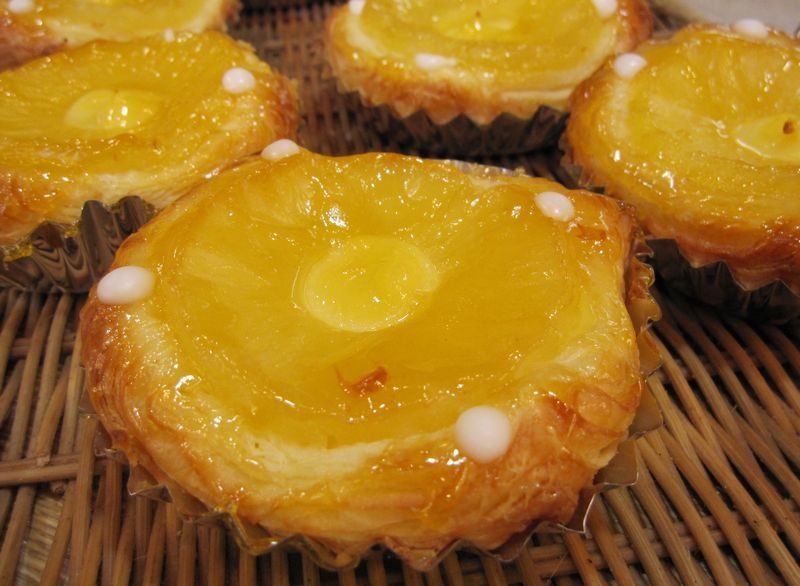 バターたっぷりのサクサク食感生地に、カスタードクリームとパイナップルをのせ、あんずジャムをコーティング。開店以来の人気商品です。【150円】