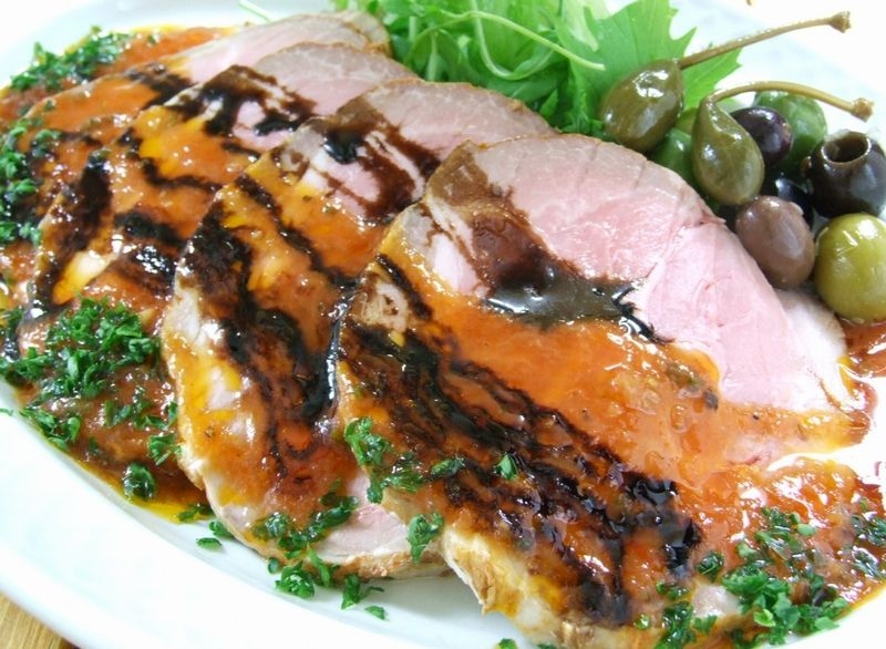 パプリカを練りこんだ豚ロース肉をじっくり焼き上げました。さっぱりトマトソースのドレッシングで召し上がり下さい。