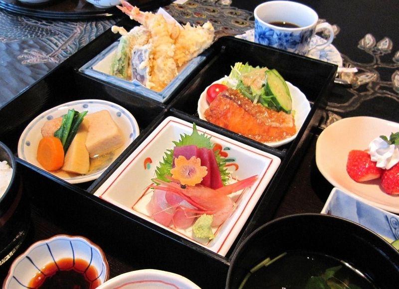 刺身・天婦羅・煮物・焼物を丁寧に盛り付けました。ご飯・漬物・汁物・フルーツ・コーヒー付。お味と共に目でもお楽しみ下さい。【1,575円】