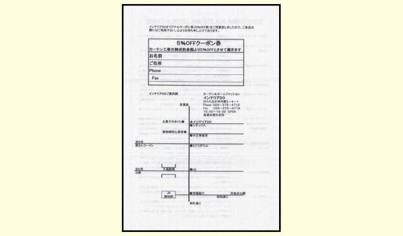 店内に置いてある5%OFFクーポン券は、カーテン工事の際に御利用出来るリーズナブルサービス。