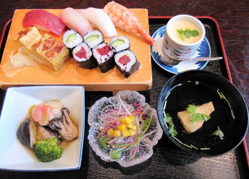 にぎり(5貫)・巻物1本・茶碗蒸し・煮物・サラダ・吸物・食後にうれしいコーヒー付(セルフサービス)。