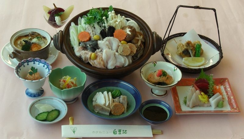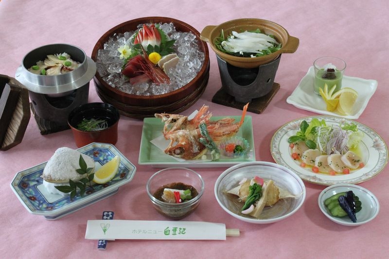 オーシャンビューの客室、海の見えるレストラン、露天風呂のある天然温泉でリラックスしていただき、地元の漁港で水揚げされた新鮮な魚介類と地元産の野菜を中心にした旬の食材を使った季節感いっぱいの会席料理、レストランのランチ料理もお楽しみいただけます。特に冬季(10月~3月)には「アンコウ料理」が絶品です。