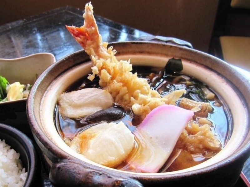 大きな海老天に切り餅までは入ったなべ焼きうどん。化学調味料を一切使用してないつゆは、身体の芯から温まります。