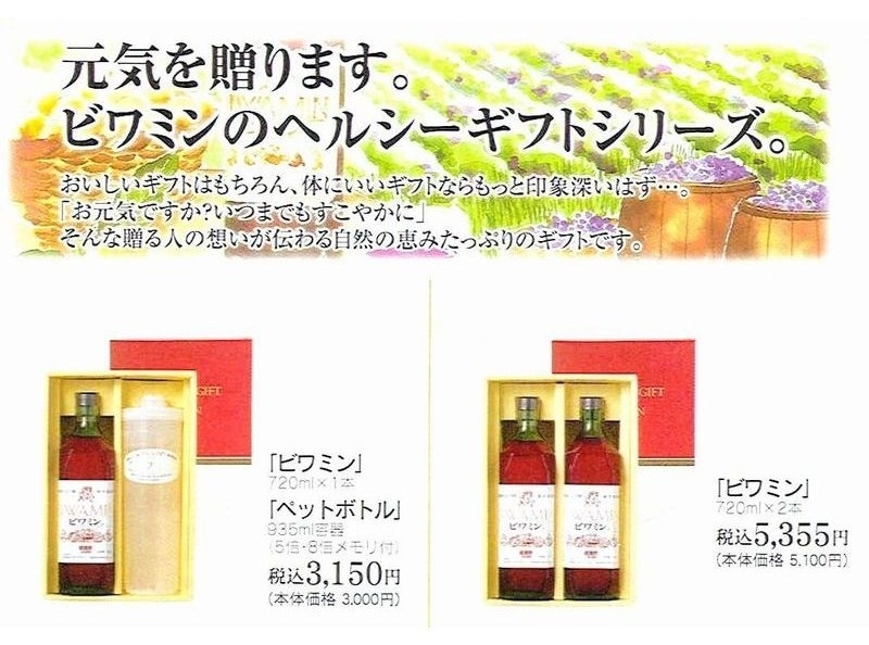 ビワミンは、巨峰を木樽で発酵熟成させたワイン酢と米酢を主原料にビワの葉エキス・ビタミン・カルシウム・ハチミツ・ローヤルゼリー等を加え、各種成分の栄養バランスを考えて開発されました。