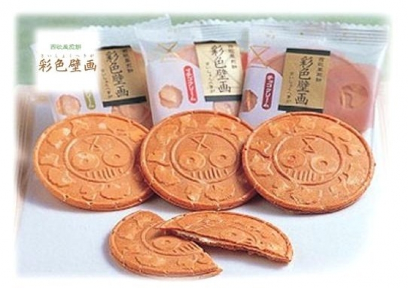 1300年前に描かれた虎塚の「彩色壁画」。虎塚古墳の壁画を形どり、苺・チョコ・バナナクリームをサンドしたサクサクの洋風煎餅です。【10枚袋入/600円】