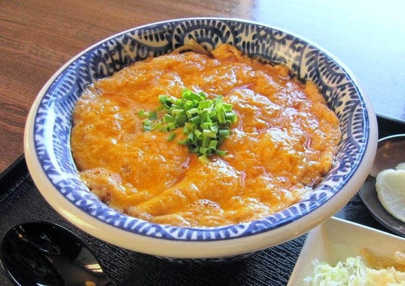 半熟の卵は養鶏所直送。ふわふわの卵と太麺がからむ卵とじは女性の方に人気メニューです。