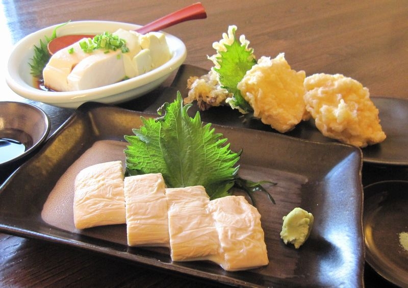千葉県から取り寄せた青大豆を使った豆腐はそばつゆをかけてご提供。ゆばの刺身はもちろん、珍しいゆばの天ぷらは、そばの前やおつまみにも!!【350円~】