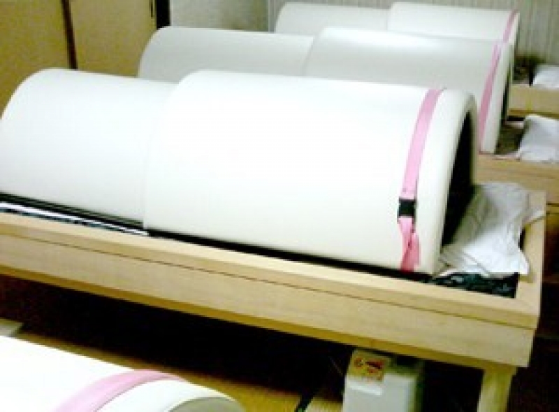 秋田県玉川温泉の入浴法。暖まった天然岩盤の上で横になりサウナのような発汗を促します。健康や美容に効果が期待でき、体の内部より浄化します。