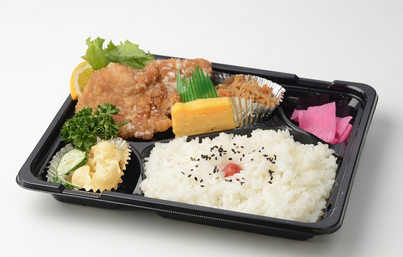 鶏肉を叩くところから調理し、柔らかくジューシーに仕上がるよう、手間暇をかけて下ごしらをしています。からっと揚がった冷めても美味しいから揚げ弁当です。
