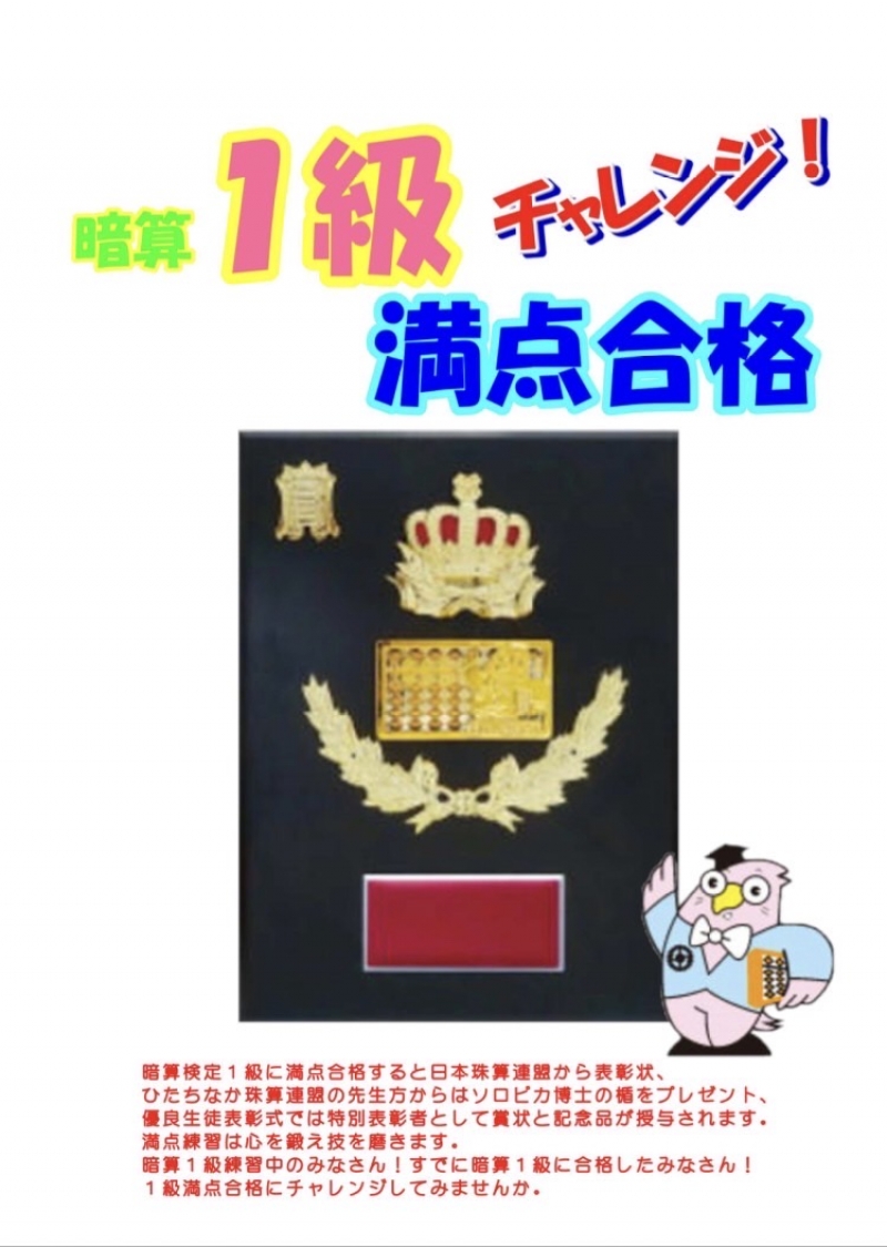 珠算1級、暗算1級の検定試験で、1問もミスすることなく満点で合格すると、日本商工会議所から賞状や記念品が授与されます