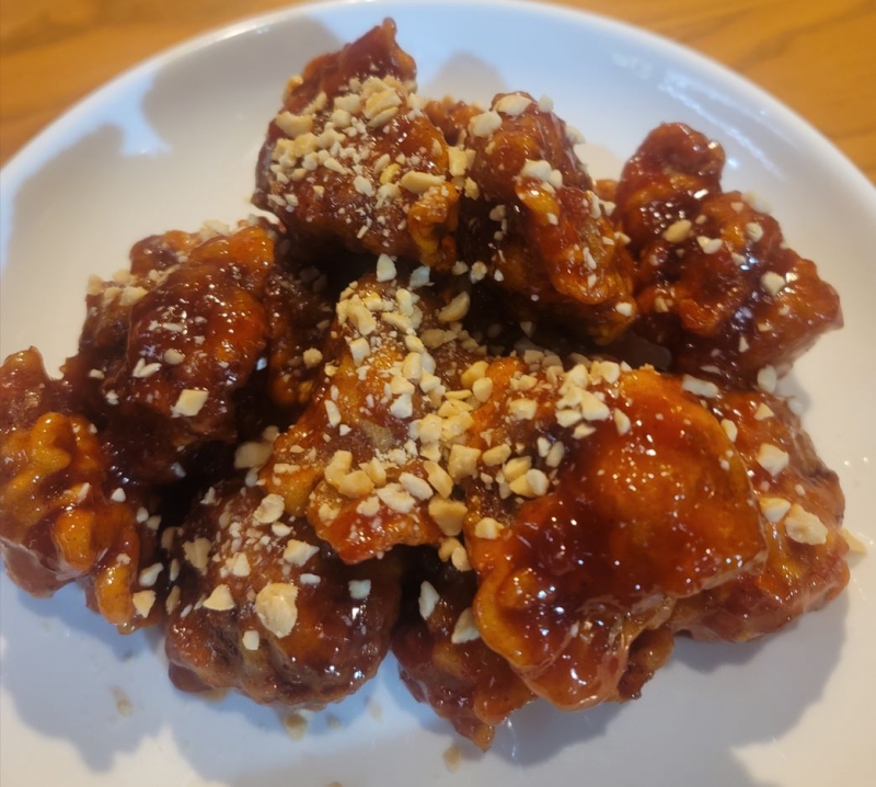 鶏肉をカリカリに揚げて、甘からソースに絡めました!韓国でも国民食として大人気です!