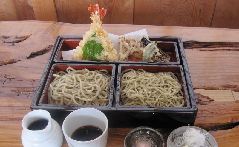 洗練されたつるつる感の細打ち二八そばと野趣豊かなもっちり感の太打ち荒挽きそばのハーモニーは絶品。えび天のサクサク音が店内に響きわたります。【1,400円】