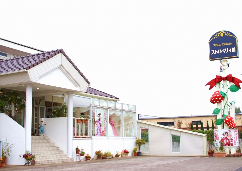 当店は、JR勝田駅より徒歩15分。昭和通り沿い、マクドナルドのおとなりで、白い建物と大きなイチゴの看板が目印!ワンフロアの広々とした店内には、和室の背景セットや、明るいサンルーム、かわいいお姫様のお部屋、高級感あふれる応接セットなど、撮影スポットがたくさん!かわいい衣装も揃えております。