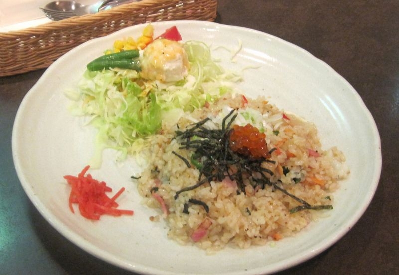 エビ、イカ、サーモンなど、数種類の魚介類を使ったピラフです。自家製醤油で仕上げました。
