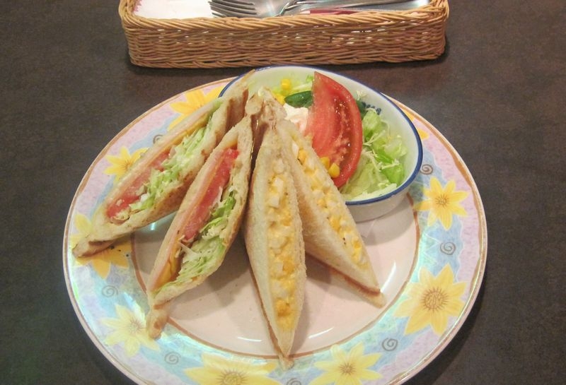 パンを4枚使ったボリュームたっぷりの焼きサンドです。サラダもついて500円の低価格。軽食にいかがでしょうか。