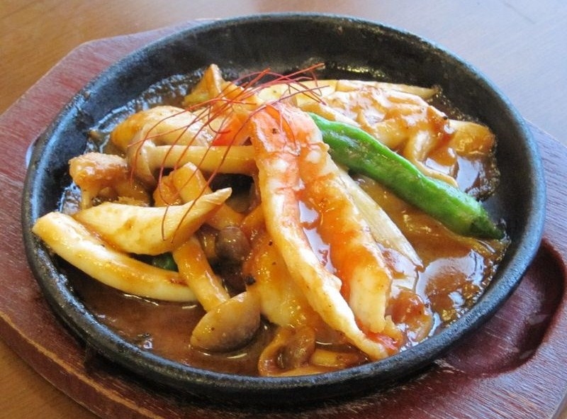 えび・いか・貝類などを三種類のブレンドした特製みそを鉄板で焼いて、あつあつを召し上がって頂きます。