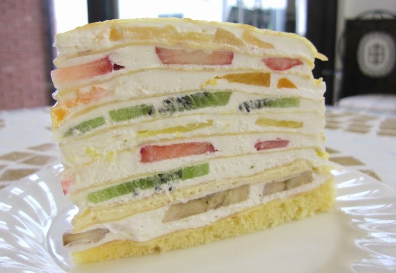 2種類のクリームと6種類のフルーツを10枚のクレープで重ねました。当店の人気商品です(10~6月までの販売です)*季節のミルクレープもございます。【410円】(税込)